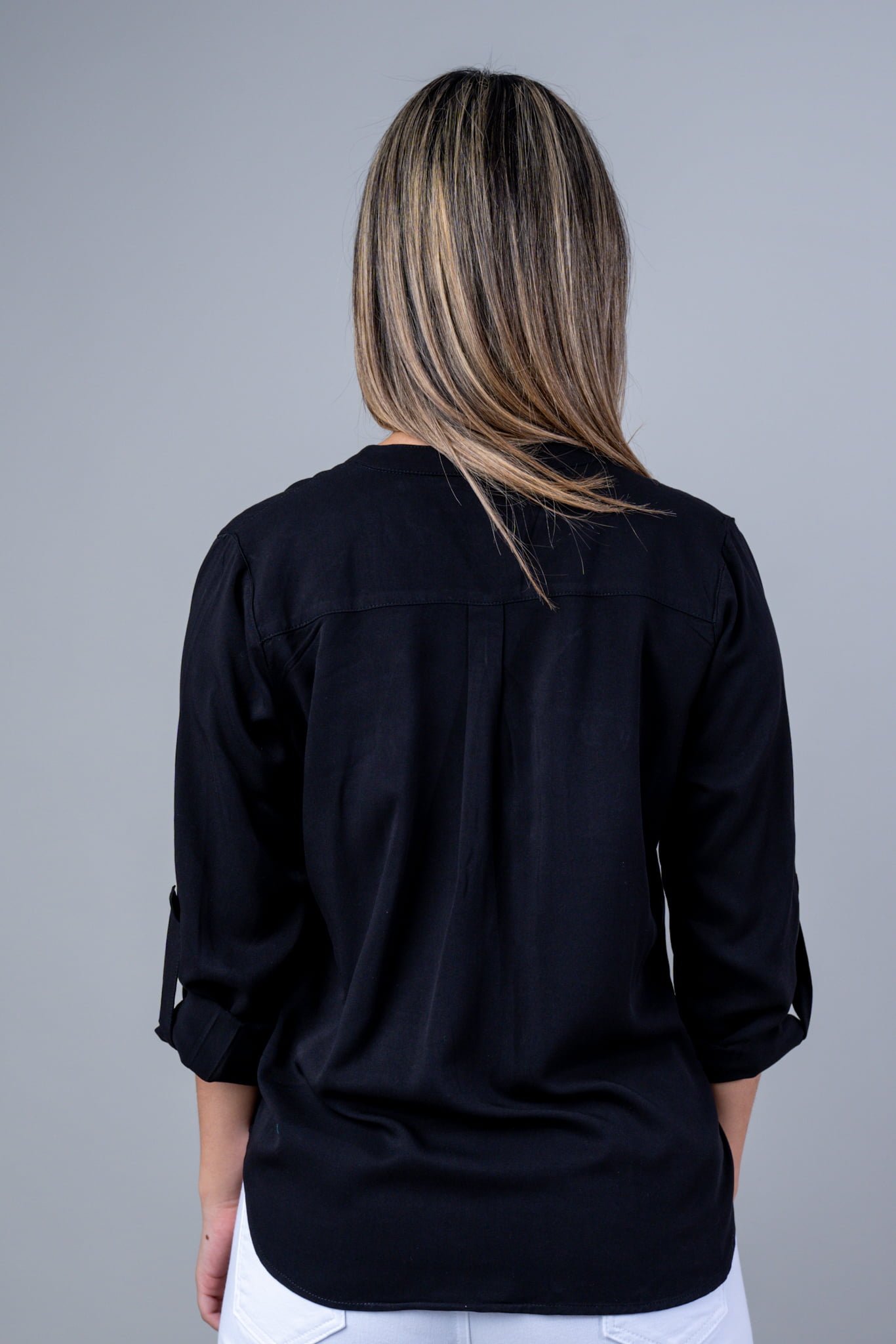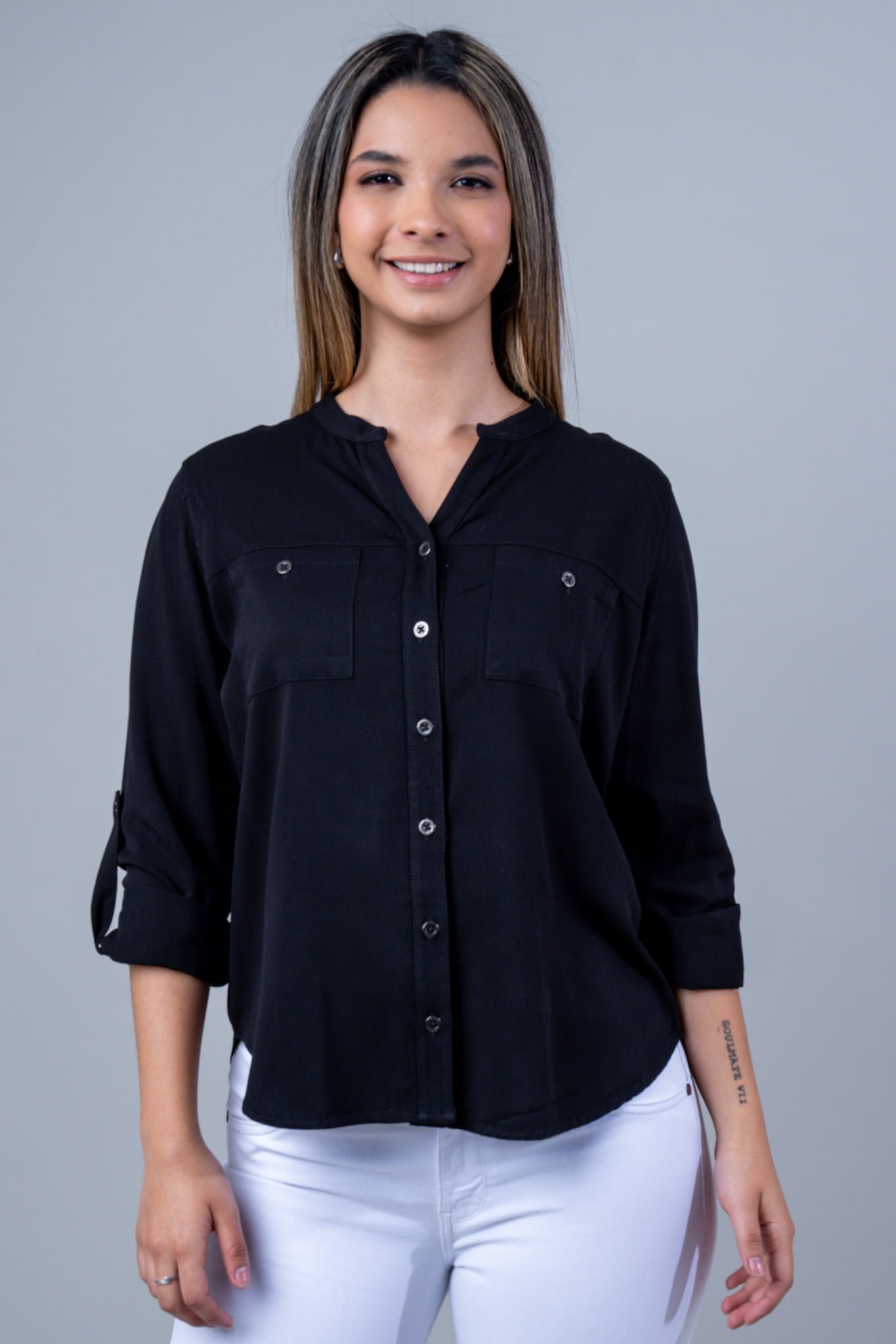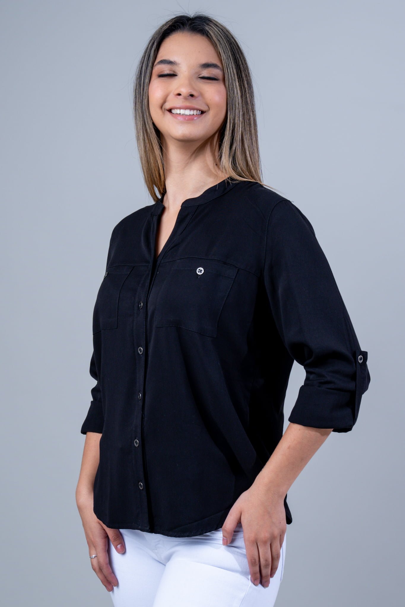 Camisa Manga Larga Cuello Mao, Botones Metalicos, Bolsilos Delanteros, y Ruche en la Manga